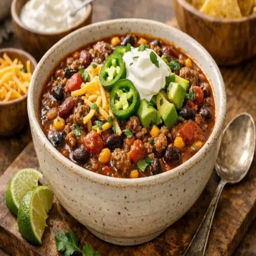 • Make it Ahead – Prepare this chili completely, cool it, and refrigerate up to 3 days before reheating. The flavors actually deepen as it sits, making it perfect for meal prep.